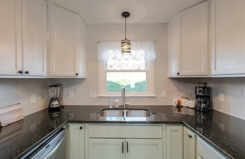 Upstairs, you’ll find 2 bedrooms (one king bed & one queen), one full bathroom (shower only) & full laundry. The spacious primary bedroom features a king bed, a 42” Smart TV, desk, reading lamps (with USB chargers), dresser, luggage rack & closet. The 2nd bedroom features a queen bed, blackout curtains, reading lamps (with USB chargers), dresser, luggage rack & closet. A renovated bathroom w/ a glass-shower enclosure & a new washer & dryer complete the upstairs.