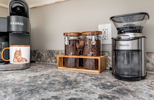 K-Cups, ground coffee and whole beans are provided. You'll also love having sugars/sweetners, syrups, and creamers!