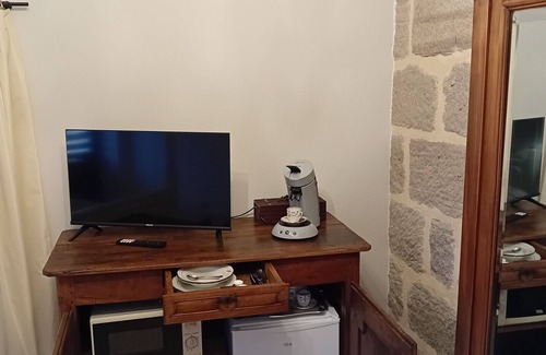 You will find everything necessary for a pleasant stay: a 5 m² terrace with garden furniture, WiFi internet access, electric heating and covered parking within the same building. For your moments of relaxation, the accommodation also has a television with satellite channels.The main room is fully equipped, includes a double bed, a mini fridge, a microwave, as well as the bare essentials to enjoy your stay (crockery, cutlery, coffee maker and kettle).This studio is the perfect place for a refreshing getaway and discovering Brive-la-Gaillarde and its surroundings.Please note that our accommodations are not equipped with condiments, food products (salt, pepper, oil, etc.), or toiletries such as soap. Remember to bring what you will need for your stay.Coffee maker type: Senseo