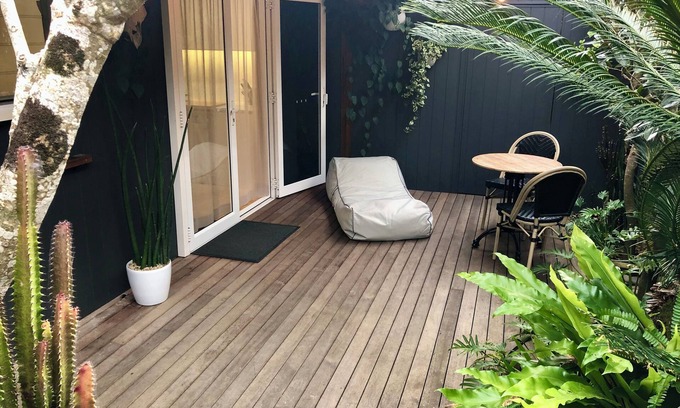 The Bungalowvsleeps 2 in a Super Comfortable, Queen sized bed. Off the bedroom is an ensuite bathroom, with twin shower and heated towel rail. The living area is open plan with super comfortable 3 seater lounge, plush shag pile mat, and 50 inch lcd tv. Plants adorn the interior and exterior. The kitchen, with Ceaserstone top and glass splashback, has a large fridge, dishwasher, convection oven / microwave and “portable “ induction cooktop. There is also a combination washer - dryer. Open the double doors onto the large private deck, for your own “alfresco” dinning area with outdoor table and chairs. There are also table and chairs inside. The Deck area is secure and private, with hot outdoor shower, and all weather bean bags.