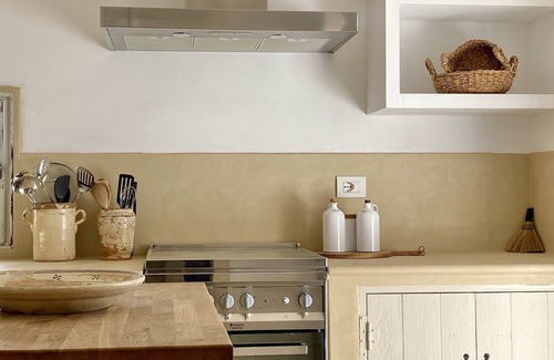 Separated from the pool by mediteranean grasses and herb-filled stone planters, the outside kitchen features a stone prep island with an electric hob and fridge, a classic woodfired pizza oven, and barbecue grill adjacent to a shaded dining pergola furnished for those long lazy lunches and memorable dinners under the Puglian stars