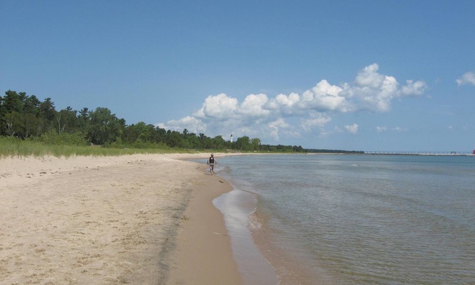 The house is 40 feet away from our expansive sand beach, (across the small rustic lane) the total sandy area is approximately 1 acre. The lake shore is super sandy and the lake bottom is hard sand, gradual depth, great for kids, and your (leashed) dog too!