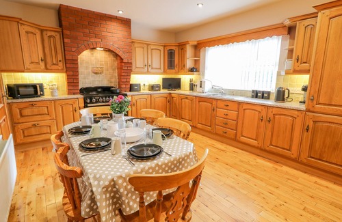 The living areas in this large bungalow consist of a kitchen equipped with oil range cooker, microwave, fridge/freezer and dishwasher, a dining room for eight, a sitting room with gas fire and TV and a conservatory, there is also a utility room with washing machine, microwave and gas hob. The bedrooms consist of a king-size room, a family room with king-size and single bed and a single room, serviced by a family bathroom. Outside there is plenty of off-road parking and a garden with hot tub, and within 0.8 miles there is a shop and pub. Pet-friendly. Sorry, no smoking. WiFi, fuel, power, bed linen and towels are all included in the price. Braeside Farm House is a lovely setting for a family holiday in Northern Ireland. Charging electric cars is not permitted at this property, however, there are car charging facilities available in the local village, which is 2 miles away