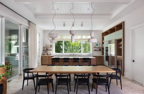 Located in Old Naples, "Swiss Miss" is steps away from the shimmering Gulf of Mexico and from the bustling 5th Ave with all its delicious restaurants and cool shops. The exterior of the home is a masterpiece of modern Key West architecture that seamlessly blends with the surrounding natural beauty.