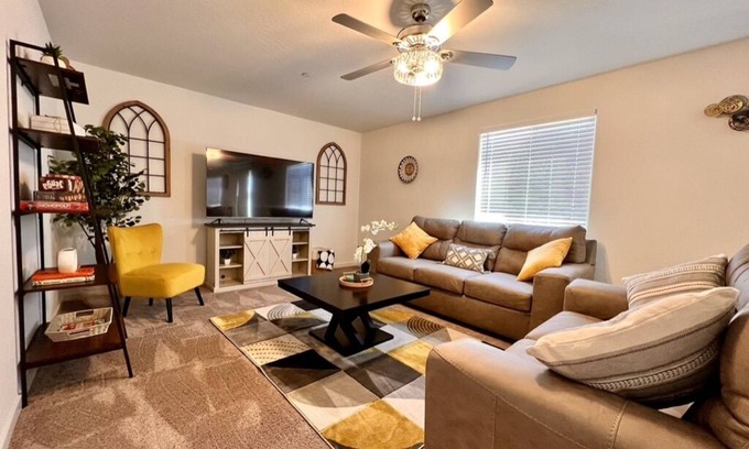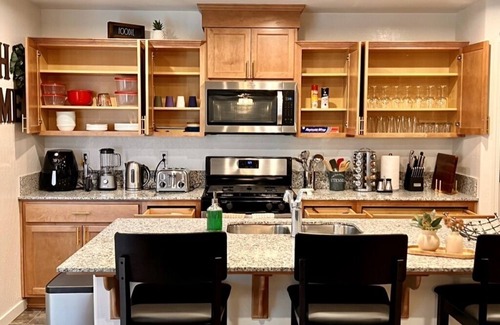 WiFi available. Smart TV in living room and Master bedroom. Comfortably sleeps 12: Includes 1 king bed, 3 queen beds, 1 twin bunk bed, and 1 queen size air mattress. Fully equipped kitchen with Keurig coffee maker, toaster, blender, microwave, instapot, stove, refrigerator, air fryer, electric kettle, pots & pans, dishes and silverware. Kitchen essentials provided include salt & pepper, spices, sugar. Coffee and tea are also provided. Bathrooms stocked with amenities. For your infant, a Pack 'n Play Playard and baby rocker are also provided. Board games for kids!