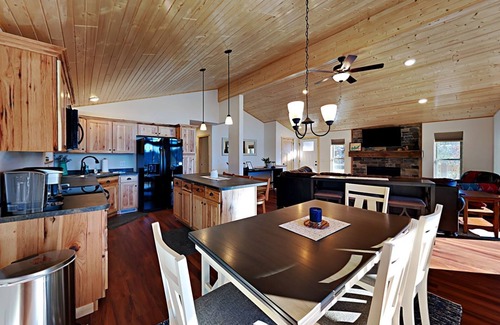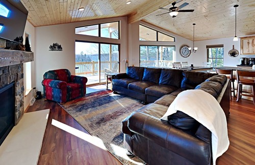 The main floor of the home features a roomy kitchen, dining area and large living room with a large comfortable sectional leather couch and amazing gas fireplace complete with a remote control. The front of the house is almost all glass and has two oversized sliding glass doors, a vaulted pine ceiling and large triangle shaped windows that let in the sunlight and frame the breathtaking views of the lake below. This amazing lake home also features a lower level walkout living room with two more oversized patio doors, a ping pong table, and additional living room with two recliners and another comfortable leather couch so even large families have room to spread out and relax. All the televisions in the home are smart TV's and are preloaded with the Spectrum App to watch local television from our local cable provider or you can log into your streaming channel of choice and binge your favorite series. The home also features blazing fast Wi-Fi for those rainy days or those of you looking to "Work from home" with a new lake view.