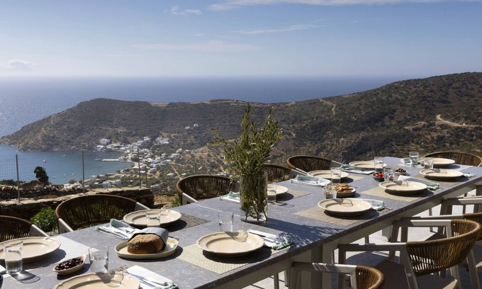 Hanging above the port of Vathy and enjoying extraordinary 360 degree views to several aegean islands this 7-bedroom villa is comprised of three separate houses which measure 350m² in total. It is built on a plateau of 5.600m² planted with olive, fig, almond and wild pear trees. Just outside the house the ancient path that leads to Vathy beach (20 min walk downhill, more uphill). This is the perfect place for one or two families that want to enjoy the Greek summer in absolute privacy but still be10 minutes away from the most beautiful beach in Sifnos.