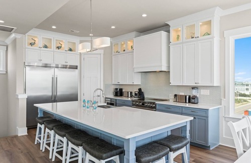 - Spacious Gourmet Kitchen: Quartz countertops. Large kitchen island breakfast bar. Stainless-steel appliances. Refrigerator with ice maker. Electric range and cooktop. Built-in microwave. Dishwasher. 2 Ice machines. Crockpot. Griddle. Air fryer. Electric Hot Water Kettle. Toaster. Dual brew coffee makers. Blender. Stock pot.