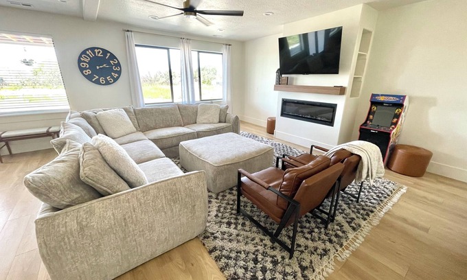 - High-End Amenities: Featuring a fully loaded kitchen, large living room, fireplace, and entertainment options like games and TV to keep your group engaged.
