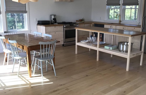 Newly built cottage with vaulted ceilings, walk to fisherman's/stone's beach and 20' x 40' heated pool. First floor master with king-size bed and private, en-suite bath walks out onto 560 square foot blue stone patio and huge lawn. Wide open living room with washer and dryer, powder room and double sliding doors offer a view to the pool and pool cabana. The generous kitchen with full-size appliances and all the appropriate cooking tools allows for meals on the patio. Indoor table for six and outdoor table for six with ample seating for guests. There are two standing height lofts. One loft has two twin beds with storage underneath and the other has a double size bed. All this leads to a huge landscaped yard, patios, stone outdoor shower, pool with patio and pool cabana with sleeping loft. Cottage is 1000 square feet