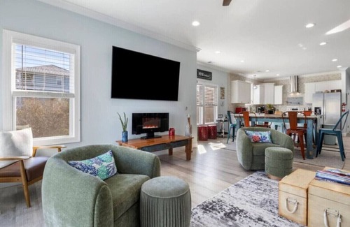 Plenty of seating in the living room for relaxing evenings. Large smart TV with multiple streaming apps and electric fireplace for cozy, cool nights.