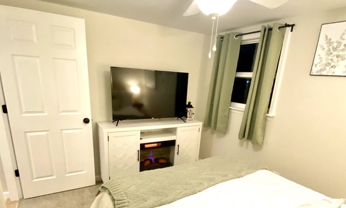 Nestled back on 14 wooden acres this Tiny Cabin is a hidden gem! This Brand New One Bedroom Cabin soundly sleeps a couple with a convertible couch/futon that is a Full size sleeper for an extra person or two children. The bedroom has a beautiful entrainment center with a fireplace for extra cozy nights.