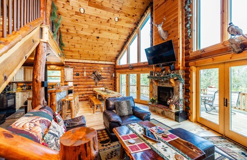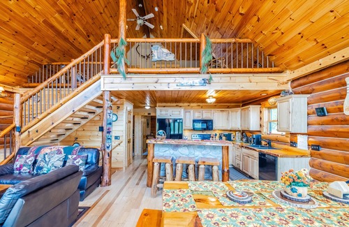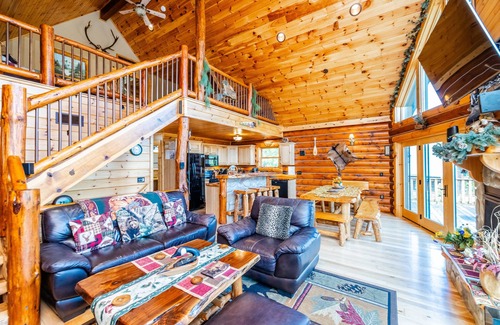 Olya's Log Cabin is outfitted with top-tier amenities that cater to both your relaxation and entertainment needs. Accommodating up to 14 guests, the cabin features three levels, including two well-appointed bedrooms on the main floor, a recreation room with a wet bar, and a loft with additional sleeping space. The open-concept layout includes a kitchen designed for group gatherings, complete with a custom dining table that comfortably seats ten. Enjoy evenings around the gas fireplace in the living room, challenge loved ones at the foosball table, or step outside to unwind on the expansive deck overlooking scenic views, complete with grilling facilities and a fire pit for cozy gatherings under the stars.