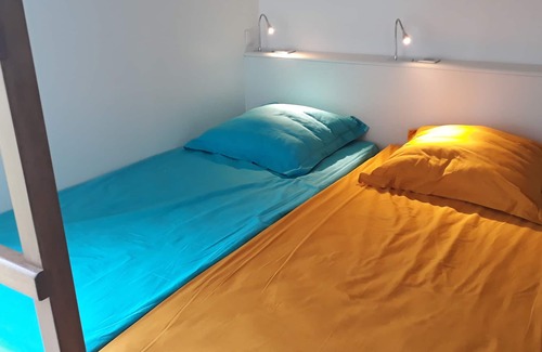 Beautiful wooden house, new, with 2 bedrooms (including a dormitory), a kitchen open to the dining area and lounge, a bathroom. Any comfort: television, internet, washing machine, tumble dryer, dishwasher, microwave, hair dryer, new bedding of very good quality (possibility linen of house in supplement).