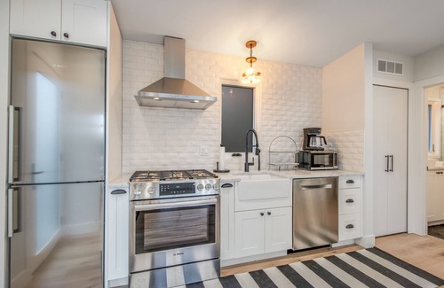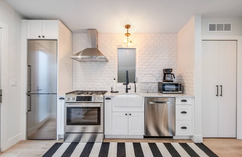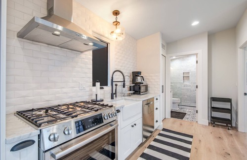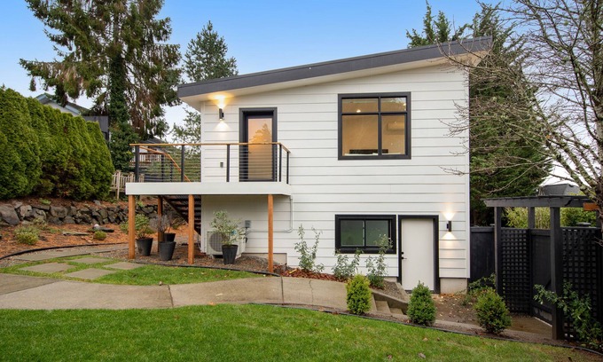 Prepare to be charmed in this brand-new backyard cottage that puts you right in the center of the best Seattle has to offer, while still offering privacy and making you feel miles away. Everything is bright and white inside, with the wide-plank wood floors that span the entire cottage creating a cozy, Scandinavian feel. Step through the front door into the main room, which features a full kitchen with sparkling new stainless steel appliances, including a five-burner stove. There's a small table adjacent for eating, and the living room offers a comfortable couch and flatscreen TV with streaming. If you're working from home, pop over to the bedroom and set up your workstation at the dedicated desk. Light floods in throughout the cottage via the large windows in the living room and bedroom, and, although you're in the center of the action, the lush lawn surrounding the cottage will make you feel as though you've stumbled into a secret rural retreat. So whether you choose to explore Seattle or stay close to home during your stay, you can't go wrong at this urban oasis.