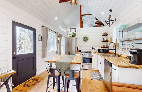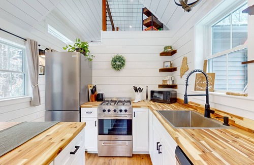 The home enjoys a modern interior with vaulted ceilings and natural light. Spread out comfortably in the living area featuring a snug sofa and a smart TV with streaming services. Watch favorite series and movies, play board games, or simply unwind while updating your social media using the high-speed WiFi available. Discover a well-equipped kitchen with modern stainless steel appliances that will make cooking a breeze and a convenient Keurig coffee maker for coffee connoisseurs. If you are in a more outdoorsy mood, treat yourself and your guests to a delicious barbecue using the provided gas grill or gather around the firepit for a storytelling session. Additional perks include a washer/dryer and an upstairs loft.