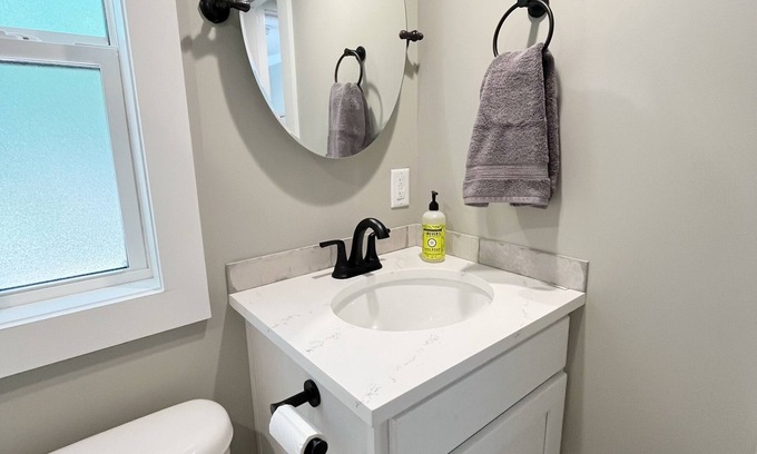 This tiny home features a kitchen equipped with all the essentials, including a microwave, toaster, and coffee pot, perfect for preparing your favorite meals. While there’s no dishwasher to speed things along, you'll have the chance to go old school, sharing laughter and conversation with your loved ones as you wash the dishes together.