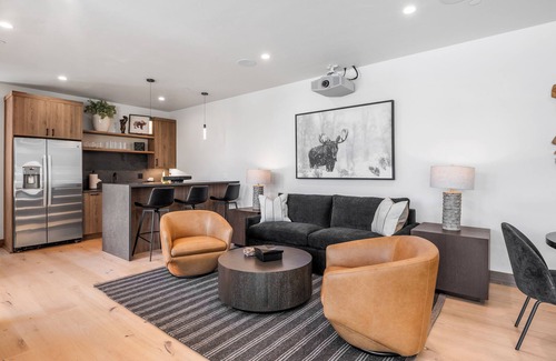 Living Area: The heart of the home features vaulted ceilings and floor to ceiling windows that enhance the spaciousness and elegance as well as breathtaking views. The plush sectional sofa by the grand stone fireplace is the perfect place to cozy up and unwind or an ideal spot to watch movies on the 75” TV with Sonos soundbar. The great room flows into the spacious dining room and Chef’s kitchen. Enjoy your favorite music on the Savant Sound System that flows throughout the house and joins with the large home theatre projector screen in the basement. The basement features an incredible entertainment area with wet bar, complete with a dishwasher and full-sized fridge, perfect for effortless hosting. There’s also an additional adjacent space for games. A Queen sleeper sofa is available in this downstairs area.