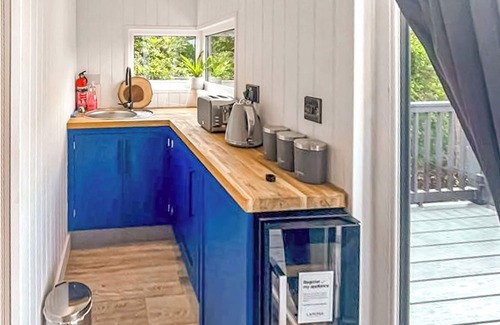 Brand new for 2021 is this stunning open plan modern hotel suite lodge. This mini lodge is our take on luxury glamping. With a double bed, shower room, kitchenette and lounge area, doors leading to a private decked area with BBQ, garden furniture, fire pit and outdoor hot tub to relax in after a day of exploring. Pets accepted in select accommodations. Within the kitchenette there is a microwave, toaster, kettle, air fryer and small fridge.