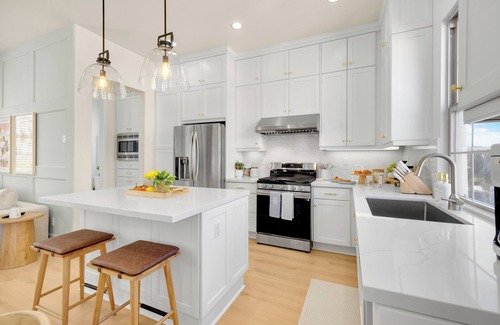The kitchen is fully stocked with all the necessary tools and appliances to whip up a delicious meal. From high-end appliances to a spacious island for food prep and seating, you'll have everything you need at your fingertips.