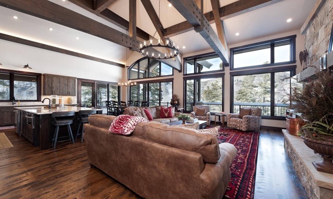 The residence is perfect for multiple families and has been outfitted to be the ultimate vacation rental with an almost endless list of amenities including a private hot tub and a huge heated covered deck with an outdoor dining table and couches, gas fire table and a BBQ Grill along with amazing mountain views. Additionally, there are 2 separate living spaces on different floors, an Arcade Game, Cable TV, high speed WIFI, a fully stocked kitchen and awesome views from almost every room. The residence is also one of the few properties in the area that features central AC.
