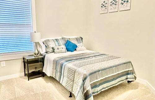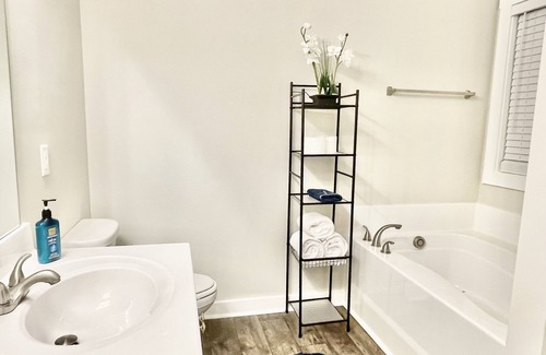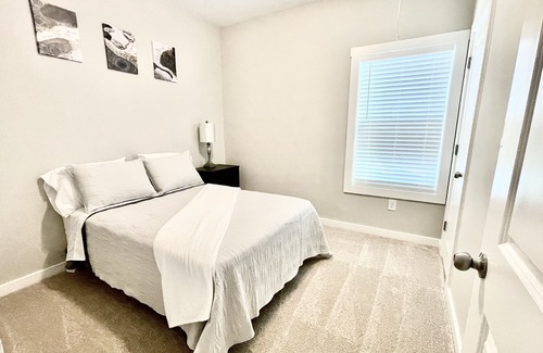 Brand New Home near mega projects, and caters to the remote worker. High Speed Internet, 150 TV channels, WiFi TV’s. Open living areas. Full living room, dining area, dedicated work space with 32” monitor/tv./printer. All the amenities like washer/dryer, full outfitted kitchen, linens, towels, hair dryer, etc. Master bath has soaker tub and separate shower stall. Main bath has tub/shower combo. Outside patio with chair & table. Amenities like fuel station, fast food, grocery within walking distance.