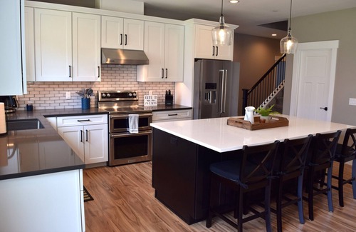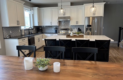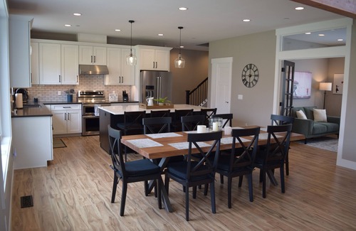 The inside features a spacious open great room with vaulted pine ceilings, gas fireplace, TV in the living room and every bedroom, en suite bathrooms for every bedroom and the bunk room, full washer/dryer, larger dining table for 8 plus 4 more at the kitchen island.
