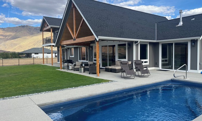 The Fast River Home at Beebe Ranch is nestled along the Lake Entiat portion of the Columbia river. This high-bank waterfront vacation rental offers the perfect blend of luxury, comfort, and natural beauty. 13 minutes to downtown Chelan, 8 minutes to Beebe Bridge Park and 10 minutes to Chelan Falls Park (boat launch, tennis/pickleball courts, swimming areas, and playground). This serene retreat has unobstructed views up and down the river and the surrounding hillside, private in-ground heated swimming pool (12'x25' and 3 1/2' to 5 1/2' deep), hot tub, large covered back patio with BBQ propane grill and patio furniture, outdoor fire pit, ample off-street parking, and a flat grassy yard for games.