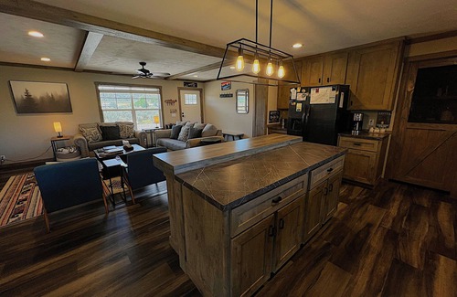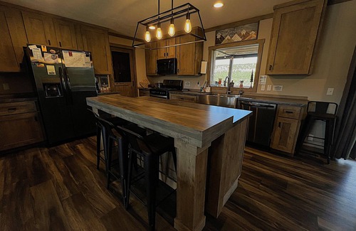 This brand new riverside home has something for everyone, but is truly a fisherman's delight! This home is a perfect place to gather and enjoy a wide array of activities our area has to offer, or just to relax and unwind in the fresh mountain air. The open living space features a large, fully stocked kitchen, plus a dining table and bar seating. The house has a reverse osmosis faucet which is hooked up to the refrigerator for drinking water. Starlink WiFi is available for streaming or working remotely. The living room has a sofa sleeper for additional sleeping arrangements. The master suite has a king bed, TV, and private bath with dual vanity, shower, and large soaking tub. The second bedroom has a queen bed and TV and the third bedroom is perfect for the kids with a full futon, twin bunk, and TV. These two rooms share a full bath. A full washer and dryer is available for guest use. Enjoy the views from the new deck with plenty of outdoor seating and a gas fire table. A private hot tub has just been installed and has beautiful views overlooking the river. Take the trail down to the riverside where you can fish or have a picnic on the shore as you watch the geese and cranes fly by. There is a full hook up RV space next to the house with 50 amp service along with septic connection and water spigot. 50 amp service can also be used for charging an electric vehicle. (Additional nightly fees apply for RV hookup use and electric vehicle charging.)