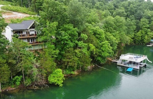 Located in a gorgeous area of this mountain lake part of TN is an Almost 4000 sq feet home with 7 bedrooms perfect for a large family and friends get together! This home is newly built in 2023. Large private dock with upper deck, slide, jump gate and covered slip below. Situated back in the cove behind Flat Hollow Marina where a no wake zone makes it perfect for floating and playing. We provide a large water mat for fun!