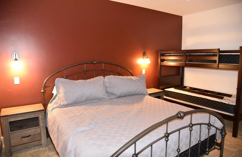Slick Rock Lodge is located in the heart of Moab just a short drive from Arches National Park, Canyonlands National Park, the Colorado River, and hundreds of miles of the best mountain biking and jeeping trails in the country. This beautiful family lodge has10 bedroom suites, 5 with walk out verandas, each with a private bath. An 18 seat theater, rec. room, family room, bike storage, 2 laundry rooms, covered patio with bar, full kitchen with double ranges and large fridges and freezers. With a large pool and in-ground spa this brand new lodge is the perfect lodging for groups up to 50 people. For groups larger than 50 people there is a 5 bedroom Slick Rock Lodge that is part of the property that you can reserve for up to 20 additional people. Book both lodges together and get up to $400/night discount on the combined total.