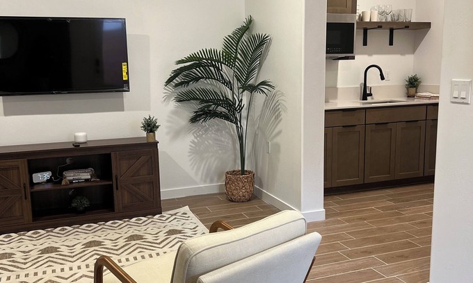 Welcome to your cozy retreat in Bakersfield! This brand-new 1-bedroom 1-bath unit offers a relaxing atmosphere perfect for working as well as unwinding. Enjoy the tastefully decorated and inviting living area with a 55-inch Sony smart TV, plush armchairs and a dining area that seats 4 people.