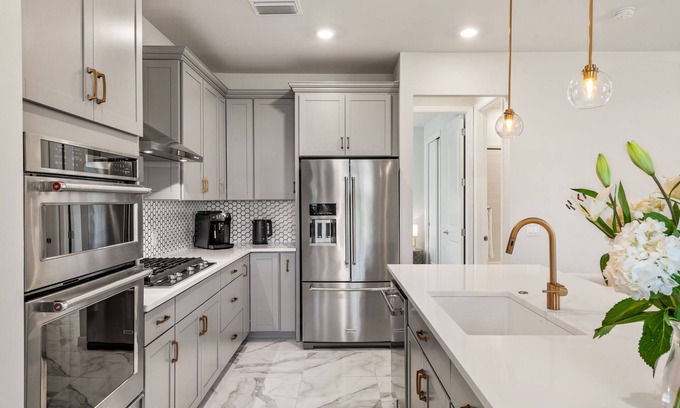 The spacious open space living area that includes a 65” smart TV and plenty of seating for the guests. The chefs kitchen is fully equipped for you to cook a fabulous dinner for your family (Coffee maker, toaster, Ninja blender, dishwasher, build in oven and microware, gas stove etc.).