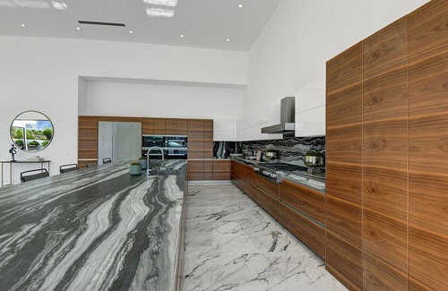 Introduced by an elegant gated courtyard, this single-level estate features an oversized pool with two tiled Baja shelves and a step-down bar area with fire pit. A pivoting glass entry door opens to an equally impressive interior with soaring ceilings, walls of fold-away glass doors, gorgeous polished marble imported from Spain, and sleek custom cabinetry imported from Germany and Hansgroge fixtures in all bathrooms and kitchen. A gallery-sized great room with dramatic linear fireplace provides space for grand-scale entertaining that opens to the kitchen, backyard, and the pool and spa. Enjoy 6 ensuite bedrooms and 6.5 baths in approximately 4,900 square feet, including Fleetwood doors and windows, Miele appliances including built-in coffee stations, smart-home lighting and communications systems, primary suite walk-in closets with built-in Italian cabinetry, illuminated bath mirrors, solar power and 3-car garages with epoxy flooring. This prestigious residential collection is moments from The Ritz-Carlton Resort & Spa, Sunnylands, Palm Springs International Airport, and luxury shopping and fine dining.