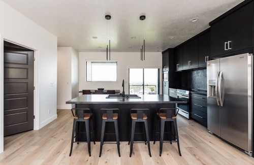 Brand new modern home. Listing is for the main floor of the house. Home is in a quiet neighborhood with breathtaking sunset views. Designer furnishings will make you feel welcome and at home. Comfortable bed and linens provide a restful nights sleep. Fully stocked kitchen has everything you need to prepare a meal. Relax on the deck and enjoy beautiful sunsets. This home is bright, airy, and inviting to all including your precious pets.