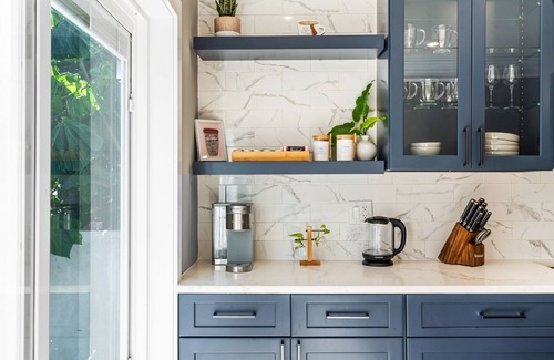 The open-concept kitchen and dining space has modern touches with stunning navy blue soft close cabinets and drawers, quartz countertops, and a sliding glass door leading to the backyard.