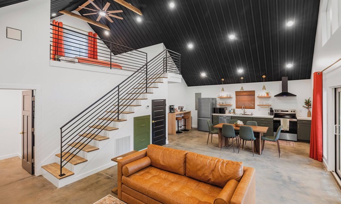 Walk into the large open main room featuring unique black metal ceilings, finished concrete floors, beautiful concrete countertops, and oversized sliding glass doors that lead to the spacious covered front porch. This barndo features stylish/modern furniture and is tastefully decorated with mountain inspiration. The living room has a 65" ROKU smart TV for streaming your favorite shows. It also has a Touchstone electric fireplace.