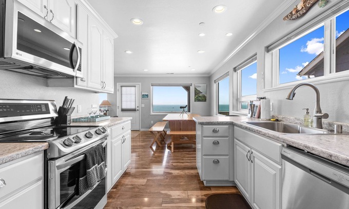 New oceanfront vacation home, finished January 2018! Unbeatable, MULTIPLE oceanfront views. Watch surfers, migrating whales spouting, ocean kayakers and boats sailing by as you relax on your front porch or inside from your choice of premiere ocean views. This upscale home is located near stairs that lead you to mile of sandy ocean beaches. You can walk along the beach collecting agates, fly a kite or just relax while listening to the waves crash on the beach, a place to build your memories. Please be sure to bring your camera to capture the magnificent sunrises and sunsets that await you!