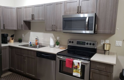 Our kitchen is also stocked with plenty of paper towels, sponges, wipes, and various other kitchen cleaning supplies. Enjoy the stainless steel under mount sinks; the stylish cabinetry and the trendy vinyl plank floors with lots of storage spaces as well as a large kitchen pantry.