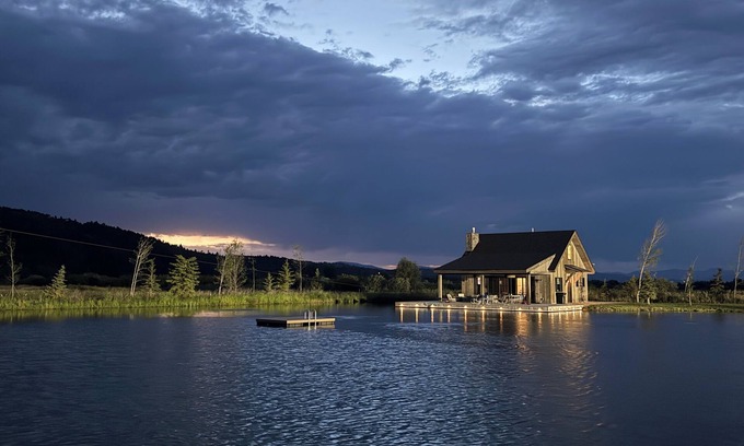 This Thayne cabin was completed in 2024 and boasts 2 inviting bedrooms with 1 king bed and 3 queen beds in the upstairs second bedroom. It also has a full kitchen and living room. The cabin is nestled on a private lake overlooking the water. An expansive outdoor deck extends out over the water. With direct access to the Salt River, this is excellent for families wanting a private place to unwind, fish, paddelboard, or zip line. The private lake is over 2 acres and features one floating dock, two shore docks, and a zip line. The lake also has brown and cutthroat trout. The cabin is located one hour outside of Jackson, WY.