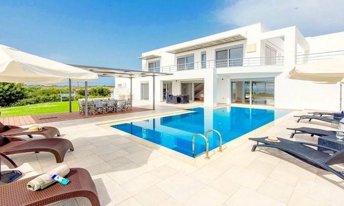 Villa Efthea is a brand new and truly unique holiday home accommodating 6/8 guests with a private pool, extensive gardens of lawn, shrubs, beautiful Mediterranean flowers and breathtaking views to the sea and the evening sunsets. Ideally placed in the exclusive area of Tersanas with a lovely sandy beach and local Tavernas within easy walking distance at 500 m and Chania at just 13 km, it's a perfect choice for a luxury holiday in Crete. The property has been built to the highest standards with wooden floors, precious marbles, air conditioning, sophisticated furnishings that combine stylish Italian design with excellent German appliances and large windows/doors that frame the stunning sunsets and give access to the large balconies and terraces. Whether relaxing by the private pool, sharing meals al fresco with a glass of local wine, or simply admiring the views and spending lazy hours sunbathing under the shining Cretan sun, Villa Efthea provides all of the comforts needed for a successful holiday and an unforgettable experience.