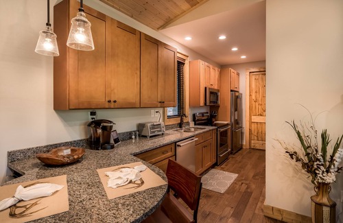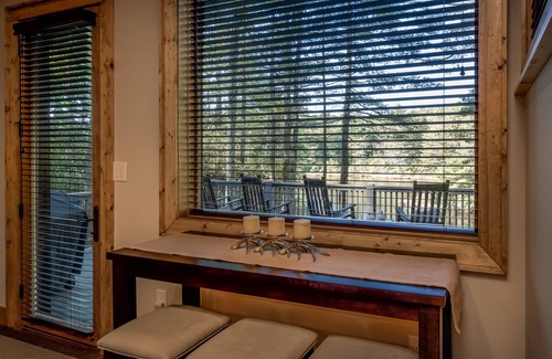 Branding Iron is a 2 bedroom, 2 bathroom house in Chinquapin, located 12 minutes from Cashiers Crossroads and 6 minutes from Panthertown Valley. The living room has a gas fireplace and flat-screen TV. The galley style kitchen is equipped with a Keurig coffee maker and stainless steel appliances and a 2 top breakfast counter joins to the kitchen countertop. The primary bedroom has a king bed and flat-screen TV and an en-suite bathroom with a walk-in shower. The second bedroom has a queen bed and an en-suite bathroom with a walk-in shower. The back porch overlooks the lake and fire pit.