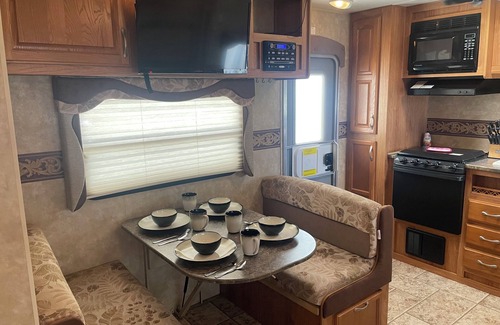 You rent the campsite. We set it up. Choose any campground in Branson and we get your camp ready. Our 30’Jayco Eagle is the perfect place to relax in Branson. The bedroom offers a queen pillow top mattress and outside entry door. You’ll enjoy a full awning, TV, board games and indoor/outdoor speakers with radio and CD. A Bible is also provided. There is a walk-in shower with removable sprayer. There is also an outdoor shower. The central heat & air works great. The sofa folds to a bed as does the dinette. A Pack N Play is available upon request. The kitchen has a 3-burner stove, oven, microwave, refrigerator and coffee maker. All dishes, cookware, bakeware, utensils, towels, linen, coffee, grilling tools, dish soap and hand soap is provided. All you bring is the food and the family. No smoking and no pets, please.