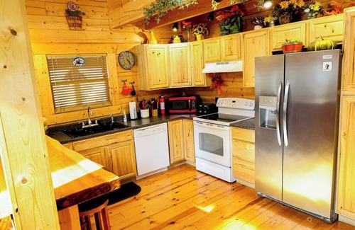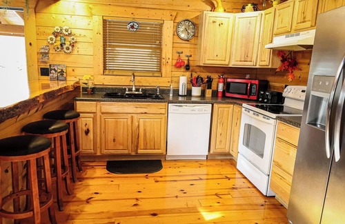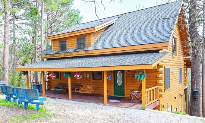 *New, Affordable Luxury, all Logs, Pine flooring, Pine walls and Pine Ceiling---no drywall *Super LOW Rates!!!*HEAVY VAULTED BEAMS 23' High*Huge 7' x 7' Log Chandelier! *2nd story has 14' High Roof * Private bedrooms with bathrooms!*Sleep up to 8 adults, kids * Large 2-3 person Jacuzzi in Private Bedroom Bathroom *Pet friendly: 3 pet max*5' Inside Balcony with chairs & table for privacy*600 forested acres in back* "Bird Sanctuary" with Fountain & Bench to enjoy !*Huge covered Porches w/ rockers/chairs in back with Picnic Table. * Out where the Coyotes howl & the Hoot owls hoot. Lots of Carolina wren & Cardinal song. And were the Woodpeckers peck*Deer, Bobcat and Bear sightings.*This Cabin has 23' down stairs and 14' high roof instead of ceiling *Fully stocked Cabin: pots, pans, towels and toiletry*15 minutes to Branson Shows*Top of the Rock- 4 miles* Beaches (3), parks (2), Marina- 5 minutes *Dogwood Canyon with Elk and Bison viewing- 15 minutes away *Easy entrance and wheelchair accessible on 1st Floor *PARKING: Plenty of Boat or Pontoon parking, (Tournament Fishermen love it!), truck, car, wave-runner on a level all-weather surface. Wheelchair Entrance. Handicap Accessible on 1st Floor with beds & Bath.*Washer, Dryer, Laundry soap & Bleach. Easy entrance for just about anyone and *Home Made Hot Process Lye Soap, 2 bars provided in your Cabin!!! See more in our Office Store! Currently, 10 fragrances, at $3.50 /bar. (Prices subject to change)* Ask about Pontoon boat rides (10 - person) complete with life preservers!. We welcome Pets and there is a Pet Fee. This fee varies year to year so view this at checkout.