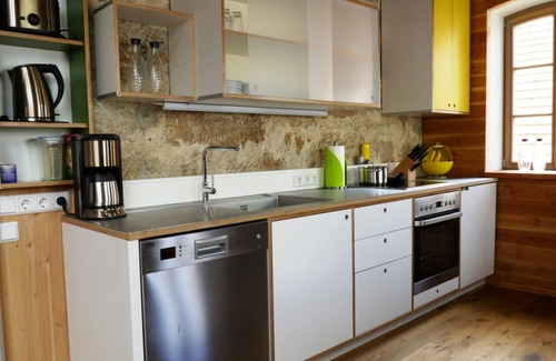 In the Apartment Hopfen you expect spacious and open living on 55 sqm. A 3rd and 4th Guest gets additionally the 22qm DZ with bath right next to it. Exquisitely furnished with natural wood furniture of the own carpenter brand 'Eichenfrau' from the bed to the kitchen, Franconian smoked oak parquet on the floors. Modern kitchen and dining area with hand-crafted solid wood furniture, adjoining cuddly corner with real leather sofa bed also 'Made in Germany', large TV flatscreen. Open bedroom with double bed 180x200 cm and oversized sheets. Then a daylight-flooded, spacious bathroom with walk-in rain shower, toilet, bidet, infrared sauna.