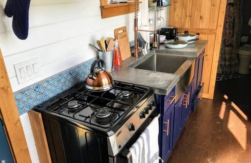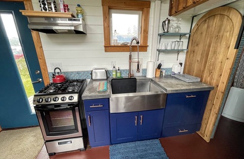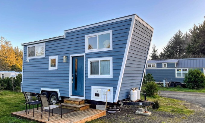 Just a short 5 minute walk to miles of ocean beaches, this beautiful Tiny Heirloom tiny home is as unique as it gets. Featuring a rock climbing wall (experienced climbers only; waiver required) with a large openable picture window, a well appointed queen bed and a full kitchen with farmhouse sink, oven and a dishwasher. End your day on a relaxing note in Breaker's jetted soaking tub. This home has everything you need to enjoy your stay on our beautiful stretch of the Oregon Coast. This tinyis located in Tiny Tranquility park, home to over 40 tiny homes - and just a 5 minute walk to miles of pristine beaches. Within the park, you'll have access to our Doug Fir lodge with ping pong, pool table, darts, board games, a TV area, free laundry after 7 pm, a fitness room and an outdoor eating and grilling area. We've also now opened our Redwood Commons with a large second story great room with ocean views, a beautiful sitting area, full kitchen and an outdoor deck. Walk around the property and check out our dog park, greenhouse with community garden and a large field to run your dogs or the kids. We're 2 miles from Waldport, 5 miles North of Yachats and a 20 minute drive to Newport. also have access to: our Doug Fir Lodge with pool table, ping pong, darts, TV room with 65" flat screen and a fitness room; a wood burning stove and outdoor eating and grilling area; our large enclosed dog park; and our Redwood Commons featuring a large great room with ocean views and an outdoor deck