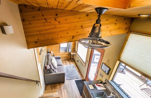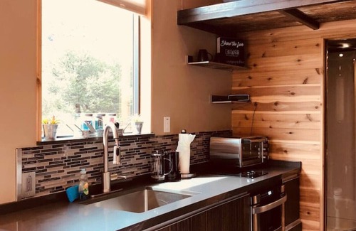 Inside, your tiny cabin retreat is filled with intention. Large windows frame Mount Wilson and the canyon beyond. A cozy loft bed invites rest, while the sleeper sofa offers a main-floor alternative. The kitchenette is stocked for easy meals, and the custom bath adds a spa-like touch. Every detail supports the art of slowing down.