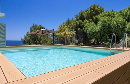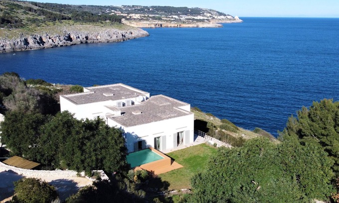 Experience the luxury of this brand-new villa, completed in March 2023, situated in a unique and peaceful location overlooking the stunning Adriatic cliffs. You will be amazed by the panoramic views over the sea and - when the sky is clear - the breathtaking scenery of the Albanian mountains in the distance. The scent of rosemary and Mediterranean herbs will fill the air, and the sound of the cicadas will accompany you throughout the summer days. Nevertheless, looking out over the rugged cliffs and the sea, you might sometimes feel transported to the breathtaking landscapes of Scotland.