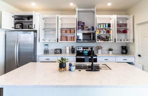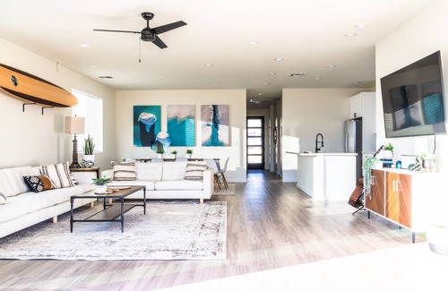 Nestled in the heart of the breathtaking Southwest, Lake Powell Surf Inn invites you to a sanctuary where the rhythm of the desert meets the comforts of home. Thoughtfully designed to balance modern style with a tranquil atmosphere, this spacious 4-bedroom, 2.5-bathroom retreat captures the essence of serenity, offering sweeping views of Lone Rock, Lake Powell, and the surrounding desert horizon framed by a grand 16-foot glass slider.
