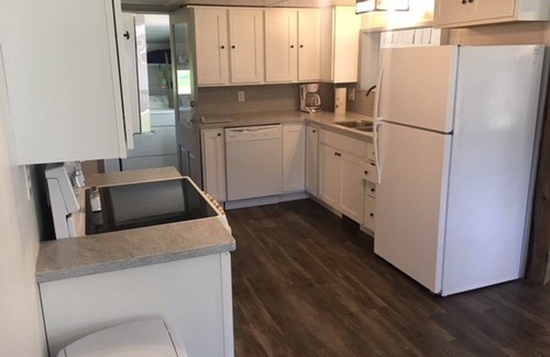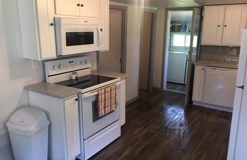 Fully stocked kitchen with oven, stove, refrigerator, dishwasher, microwave, coffee maker (bring filters) Solid surface countertops.